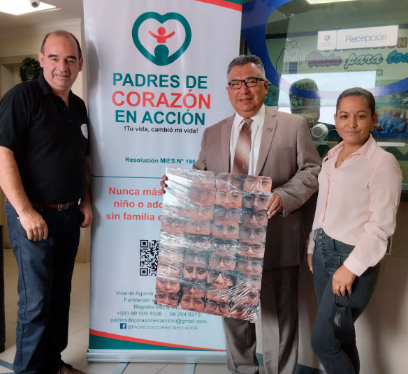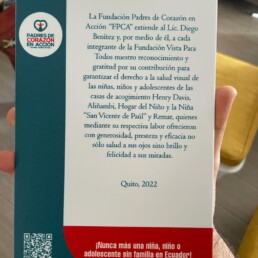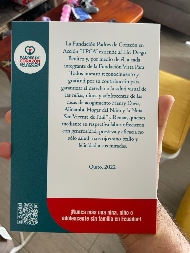 Entrega de una placa de reconocimiento al Director Ejecutivo de la Fundacion Vista para Todos, Dr. Diego Nieto por apoyar en la revision oftalmologica de mas de 300 chicos de 8 diferentes casas de acogida en Quito, se entregaron lentes a más de 80 chic@s que los necesitaban